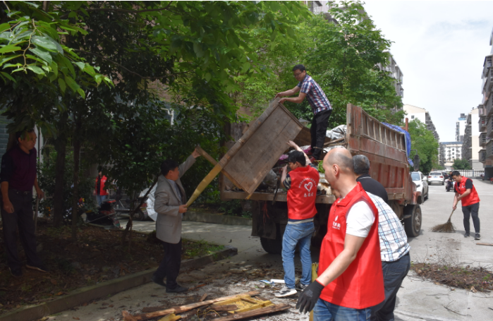 在公司黨員帶領(lǐng)下,員工們個個干勁十足,將長期遺棄堆放在小區(qū)里的雜物和垃圾抬上車裝到垃圾填埋場,