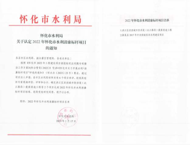 近日,從懷化市水利局傳來消息,懷化市水利水電工程有限公司(洪江區(qū)巫西城市防洪堤沅江路段提質(zhì)改造工程)喜獲“2022年度懷化市水利清廉標桿項目”榮譽,清廉建設(shè)取得明顯成效和充分認可。